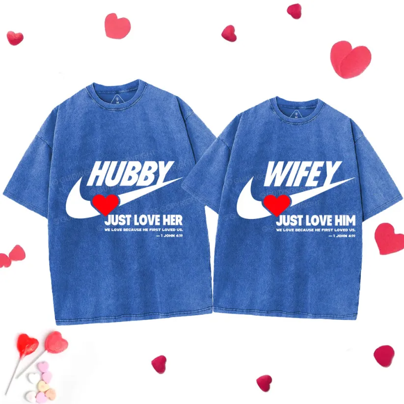 This Valentine’s, don’t just exchange gifts — exchange grace. The Just Love Him/Her Christian Couple Washed T‑Shirts remind every couple that love didn’t start with us — it started with Him.
