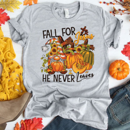 Fall for Jesus He Never Leaves Gnome Pumpkin Shirt