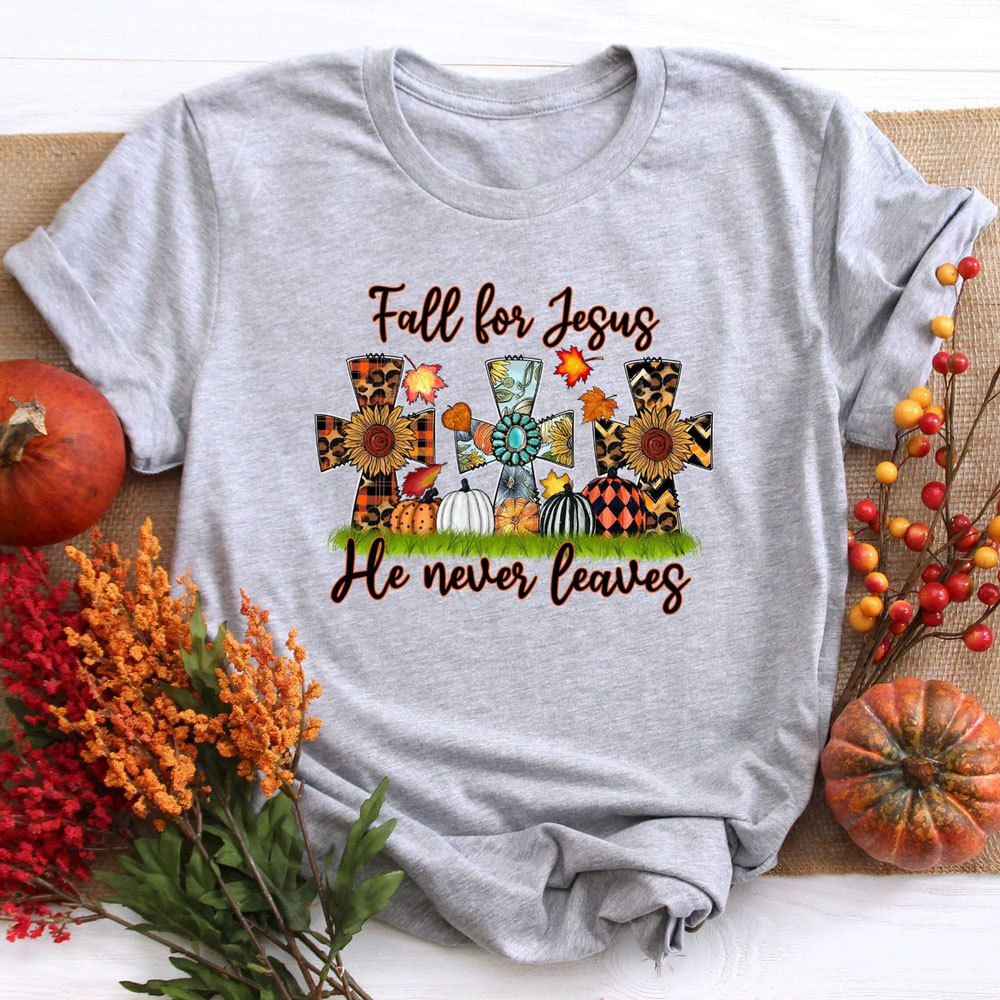 Fall For Jesus He Never Leaves Thanksgiving Cross Shirt